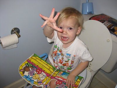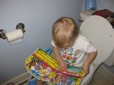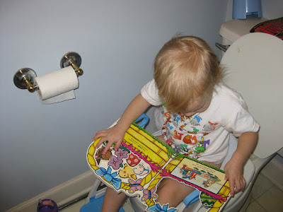 In my family, reading in the bathroom is a bit of a tradition. While we never took it as far as George did on Seinfeld (never take a book you don't own to the bathroom with you!), we always had a variety of reading materials on hand for perusing on the throne. Well, Jocelyn (who isn't potty trained, but who uses the potty from time to time ... we'll begin real training sometime after Robbie arrives!) is continuing the tradition ...