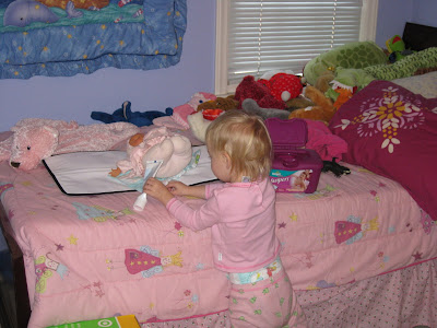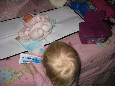 I guess the baby doll needed a diaper change! She seems to have it down. I should be able to just let her take care of Robbie when he arrives (only 25 days 'til he's due!), right?