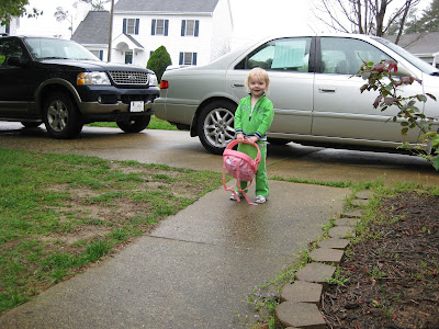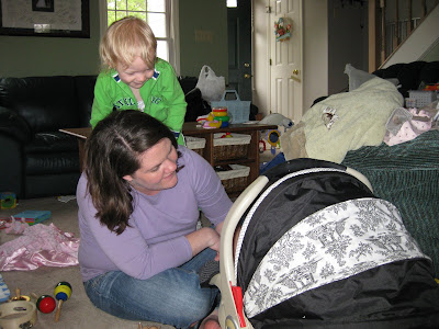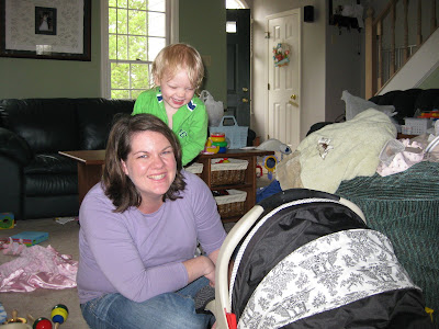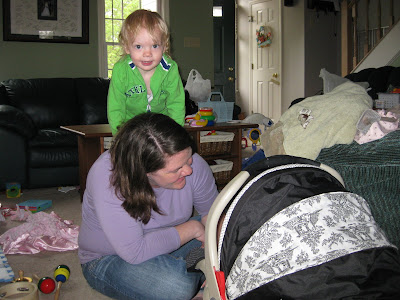 And she also wanted to check out her brother in his carrier, so what better place to check him out than a perch on Mom's shoulders?