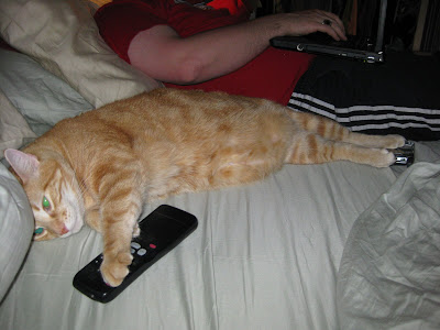 April 24, 2009 Hogging the remote and the phone April 24, 2009/ Shannon Dingle Check out Heckler's front and back paws!From April 2009