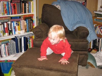 She likes us to set him on the ottoman glider so she can "rock little baby."