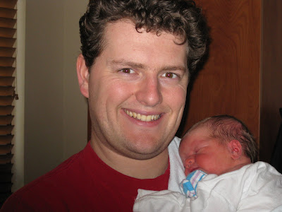 As I mentioned in an earlier post, he was 7 pounds and 5 ounces in weight and 21.25 inches in length … just as long as Jocelyn was, but nearly a pound and a half lighter! He’s a long, skinny fellow with itty bitty chicken legs and a bunch of dark hair (especially compared to his sister, who was pretty much bald until she was one … though you can’t tell that now by her mop of unruly blond hair!). He was almost two weeks early (actually, a little over two weeks early if you go by the ultrasounds and the dates I think are more accurate than the ones my doctor used), but the timing was just perfect!