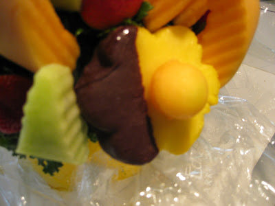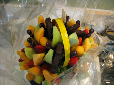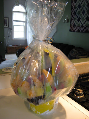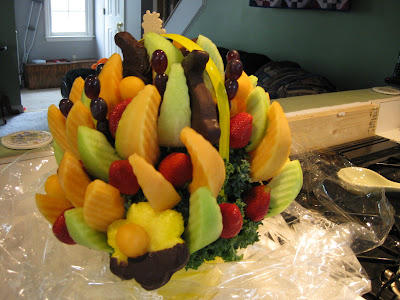 If only I could have captured a couple moments later when Jocelyn gestured with the pineapple skewer and, doing so, flung the pineapple over Lee's head and across the kitchen. Quite impressive, I must say!