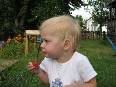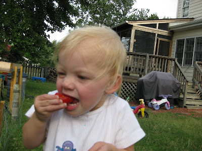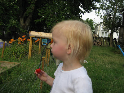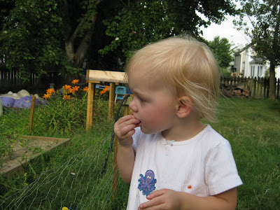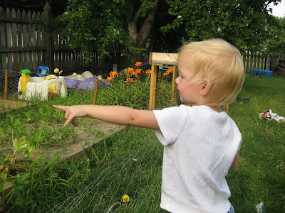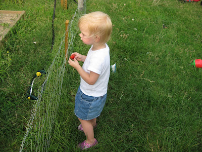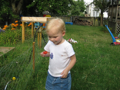 And then she points out more for me to pick for her! (By the way, the fence isn't to keep her out; she comes in with me most of the time. It's for the rabbits and other neighborhood critters!)