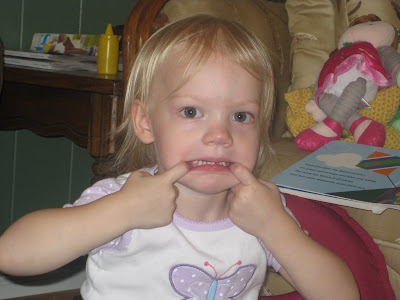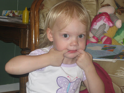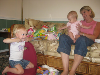 I wasn't so great at taking pictures. However, when Jocelyn insisted on bringing Hannah EVERY single one of her toys, that reminded me to get the camera out. Note the face Jocelyn made when prompted to smile, and note the pile of toys on the couch behind her (and, while you're doing that, picture Hannah submerged in that pile ... since that's where she was before her grandmother rescued her from being buried alive).