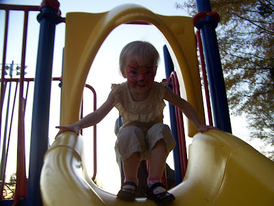 Jocelyn confused the poor woman by asking to be painted "like Heckler." After I explained that Heckler is our orange cat, we were in business! Of course, Jocelyn also requested pink. Shocker, huh?