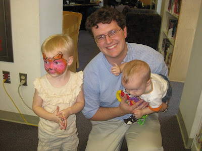 About ten minutes after we arrived, one of the librarians came over to the kids' section and addressed me and the other moms, saying, "You're all here for the face painting, right?" Umm, not really. But it was free, so why not?