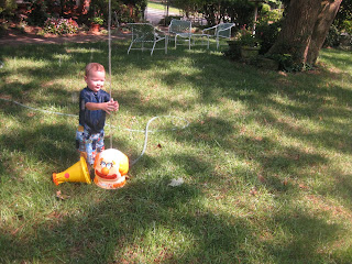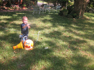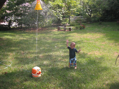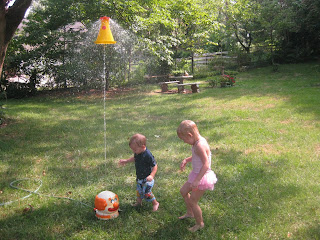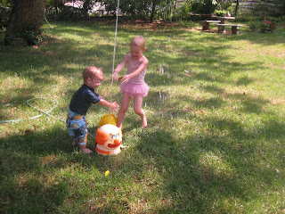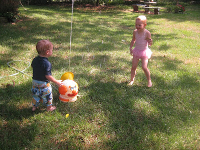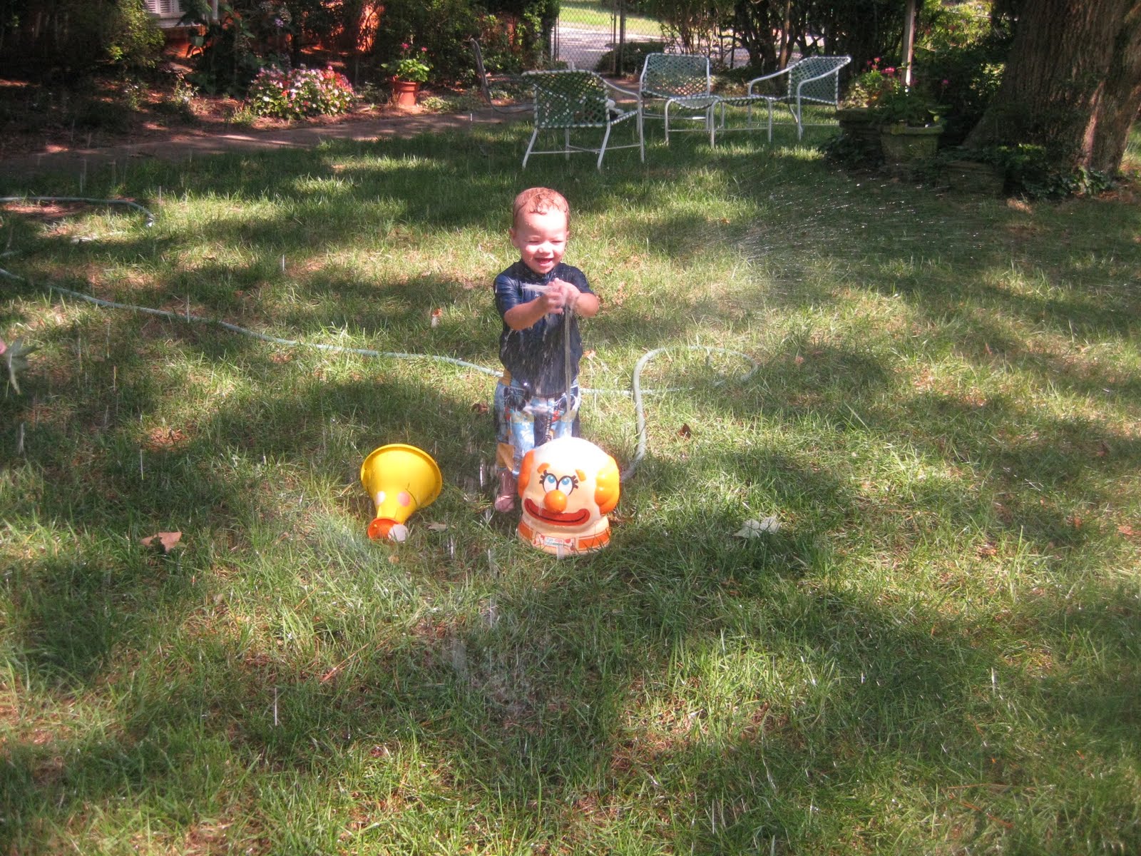 When I was little, my grandmother had this clown sprinkler thing that I loved. I'm hoping I'll be able to find some pictures of those good times, because now I have pictures of my sweet ones playing with it. New good times!
