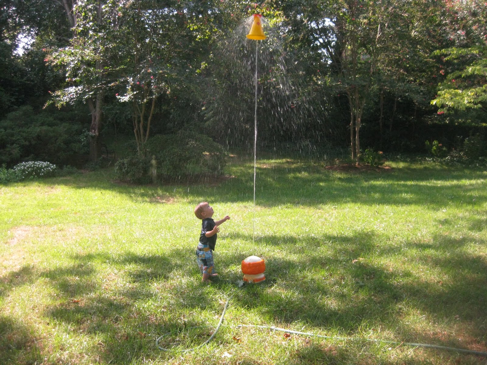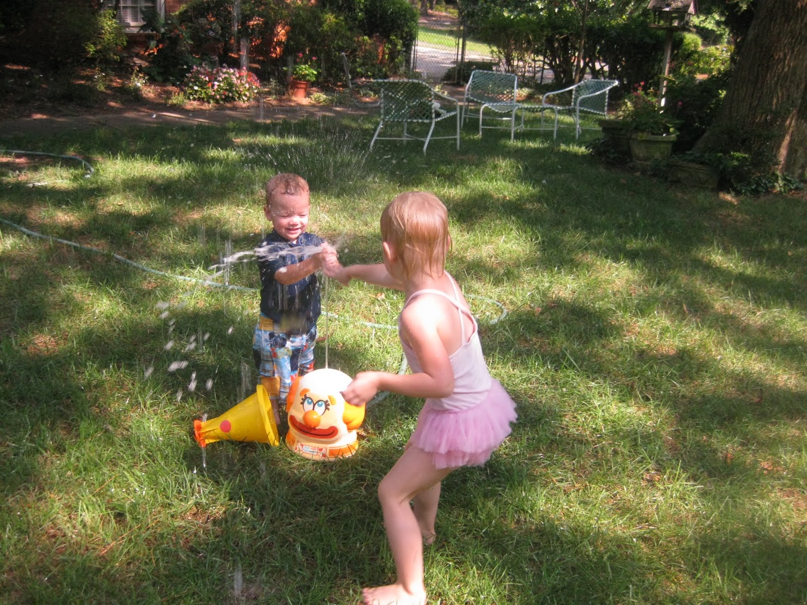 Next time we go to Nana's house, I will bring a change of clothes for me too. It took a while for them to get the hang of putting the hat back on. Which meant that Mommy had to run into the spray zone and fix it. Again. And again. And again.